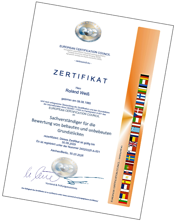 Durch kontinuierliche Fortbildungen im Bereich der Immobilienbewertung stellt Roland Weiß sicher, stets auf dem aktuellen Stand der fachlichen und rechtlichen Entwicklungen zu bleiben, um für seine Kunden bestmögliche Ergebnisse zu erzielen. Mittelfristig plant er eine Zertifizierung bei einer durch die DAkkS akkreditierten Stelle – angestrebt im Zeitraum Ende 2027 bis Anfang 2028.